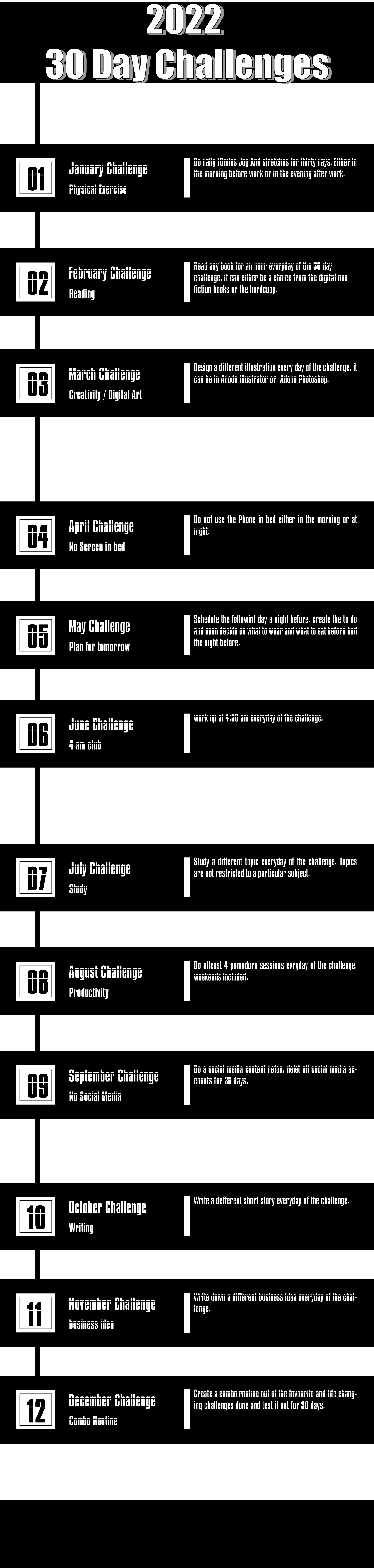 2022 is going to be an exciting year. Just like everybody else who have set for themselves new year resolutions, I have set for myself 30 Day Challenges as part of my New Year Resolutions. The 30-day challenges are a way for me to explore, learn and have fun over the year but most importantly build disciple. The idea is I document each challenge as time goes by | what I have observed, learnt and its benefits with the hope that this will help me come up with a Daily Routine in the future. Some of the challenges are for fun like the no social media challenge and others are building towards habits I think will help me in the future hence I have to try them out for 30 days straight.