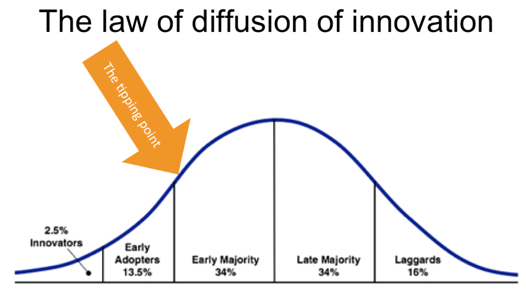 The best does not always win, the law of diffusion must be considered if mass market acceptance is important to you. It’s nearly impossible to achieve mass market acceptance if you point your marketing and resources to the middle of the bell if you aim to woo those in the middle without first appealing to the early adopters. According to Rogers, it’s because the early majority will not try something until someone else has tried it first. The goal of business should not be to simply sell to anyone who wants what you have – the majority – but rather to find people who believe what you believe those at the left side of the bell curve.